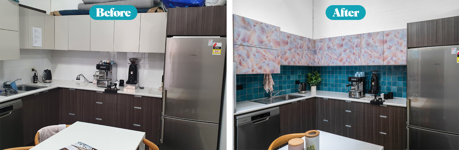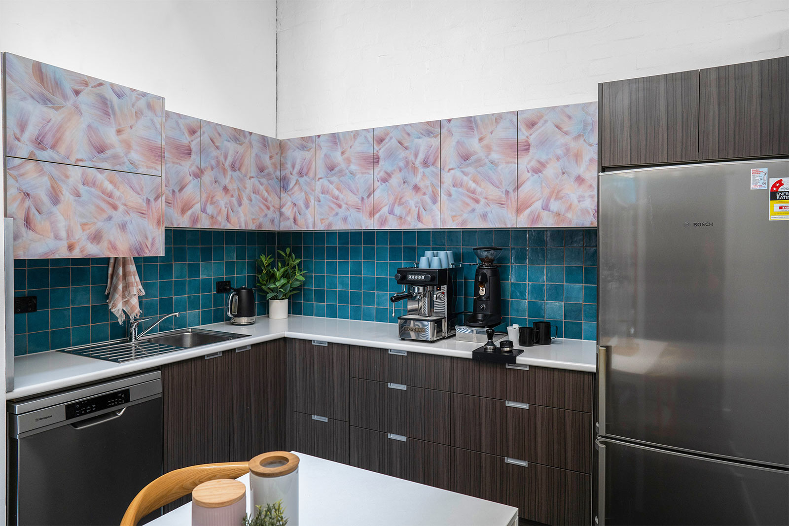 Whilst our kitchen was functioning well, we felt that it needed a freshen up to bring it into line with the rest of the renovation. Working to a small budget, a decision was made to use a couple of small design tricks to create a large impact. New tiles were installed over the top of the old ones for a pop of colour to tie in with our branding along with an unusual contrasting grout colour. In addition, we sourced some ‘peel and stick’ wallpaper that was applied to the door faces of our existing overhead cupboards. A good example to clients that clever design decisions don’t have to cost the earth.