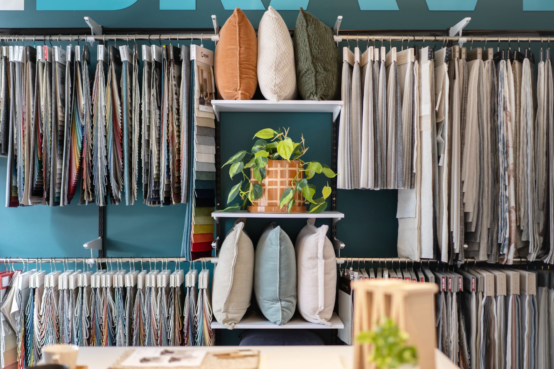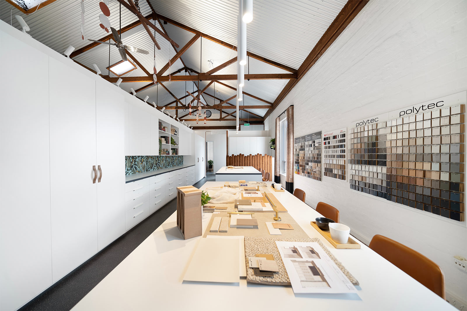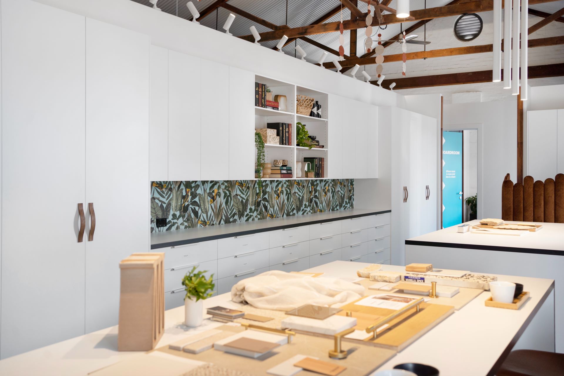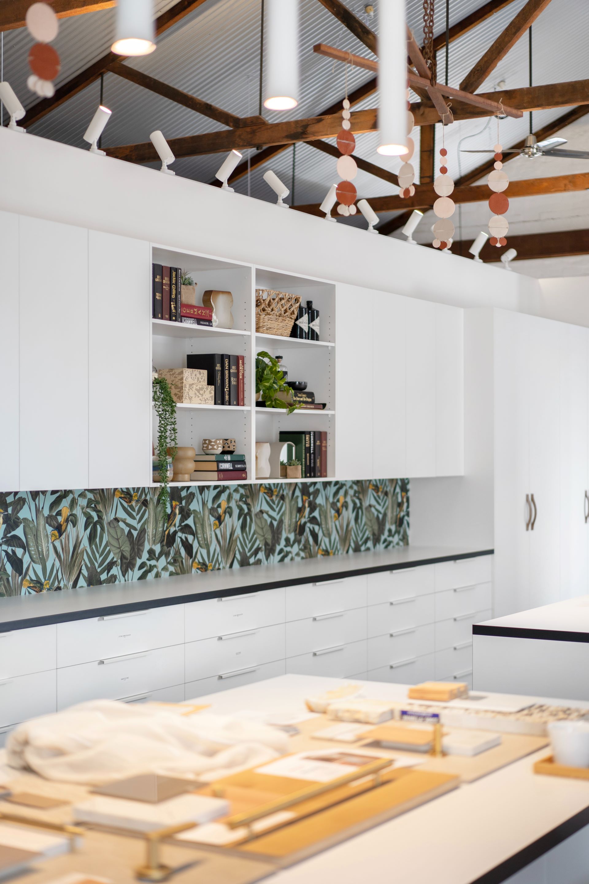For a long time, our wall fixed benchtop was a place where samples were placed and there they remained. A decision was made that the new joinery should have a lower splashback height so it could be purposefully left open for display with open shelving and a quirky, colourful feature wallpaper. Some additional overhead storage was included in the re-design to help keep samples and library items tucked away.