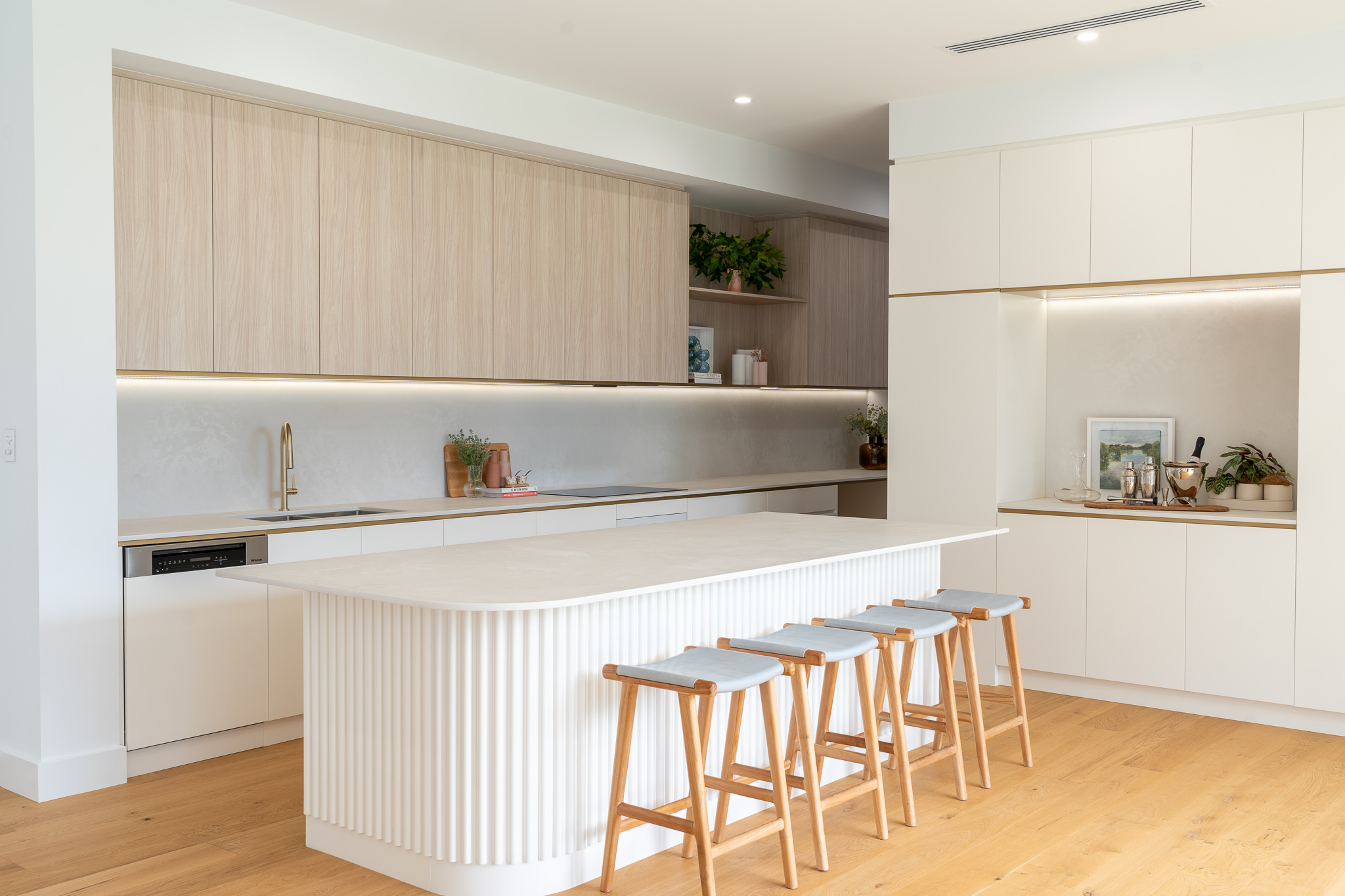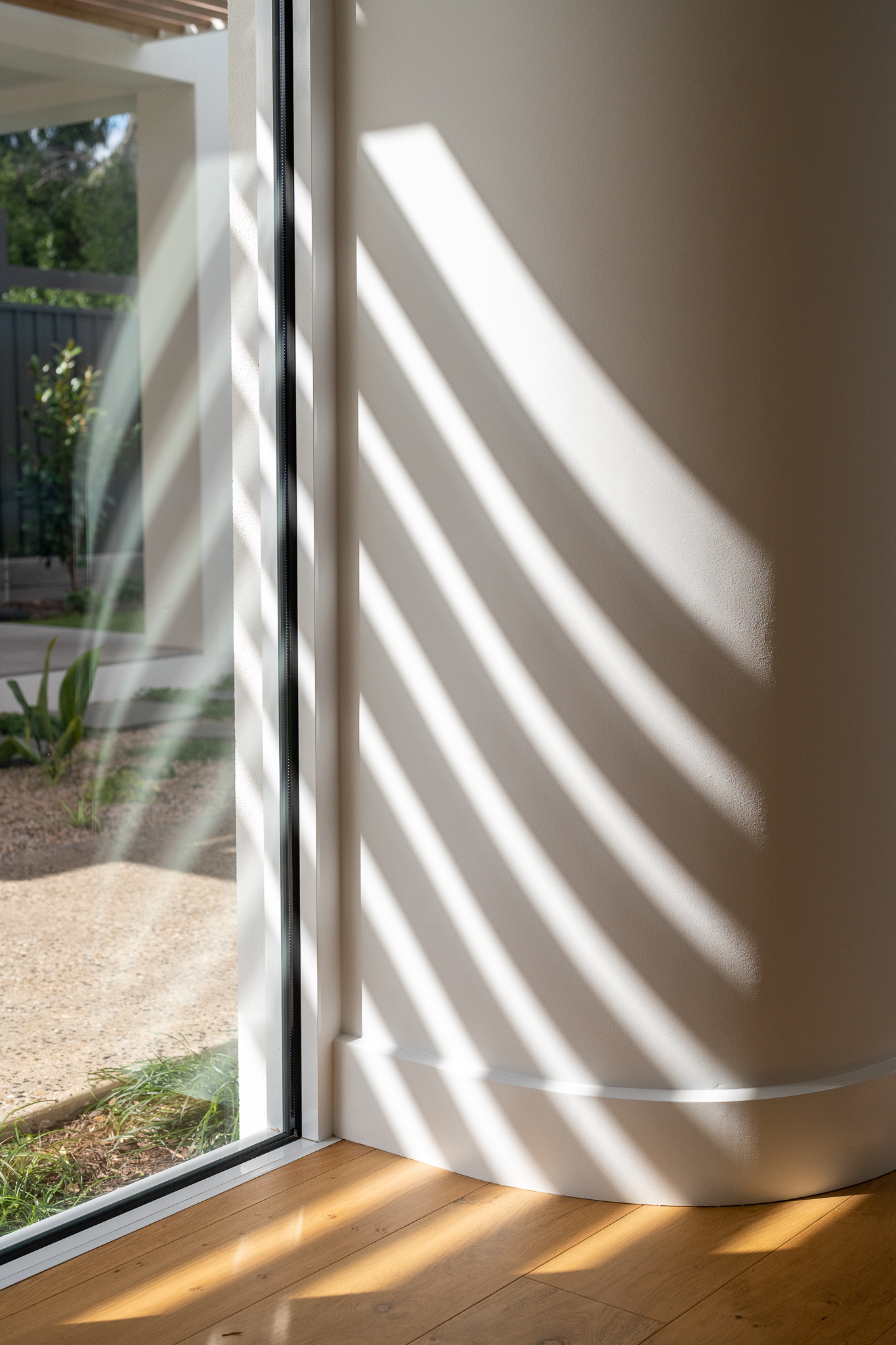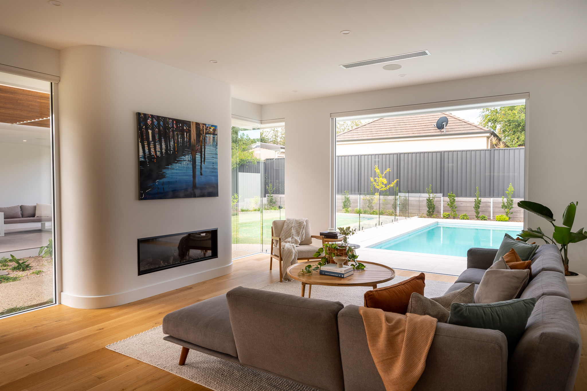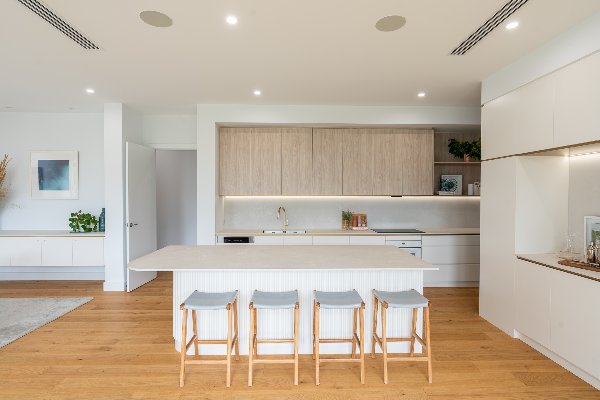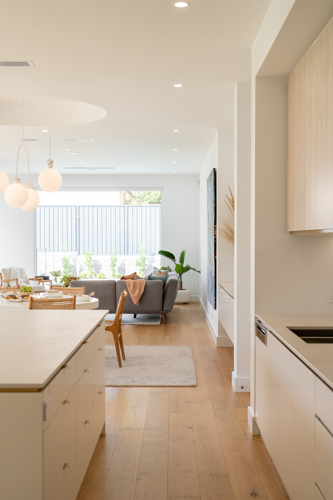 At first glance it may seem that the selection of materials and finishes here was a straight forward one. Quite the opposite as we found ourselves head down in the detail with our clients, determining how to pull together such a minimal colour and material palette that felt just right for both the exterior and interior of the home. The inclusion of curves to both the build and joinery elevate the overall feel of the home. Add in the client’s finishing touches including the pendant and large scale artwork to the dining area and it’s magic!