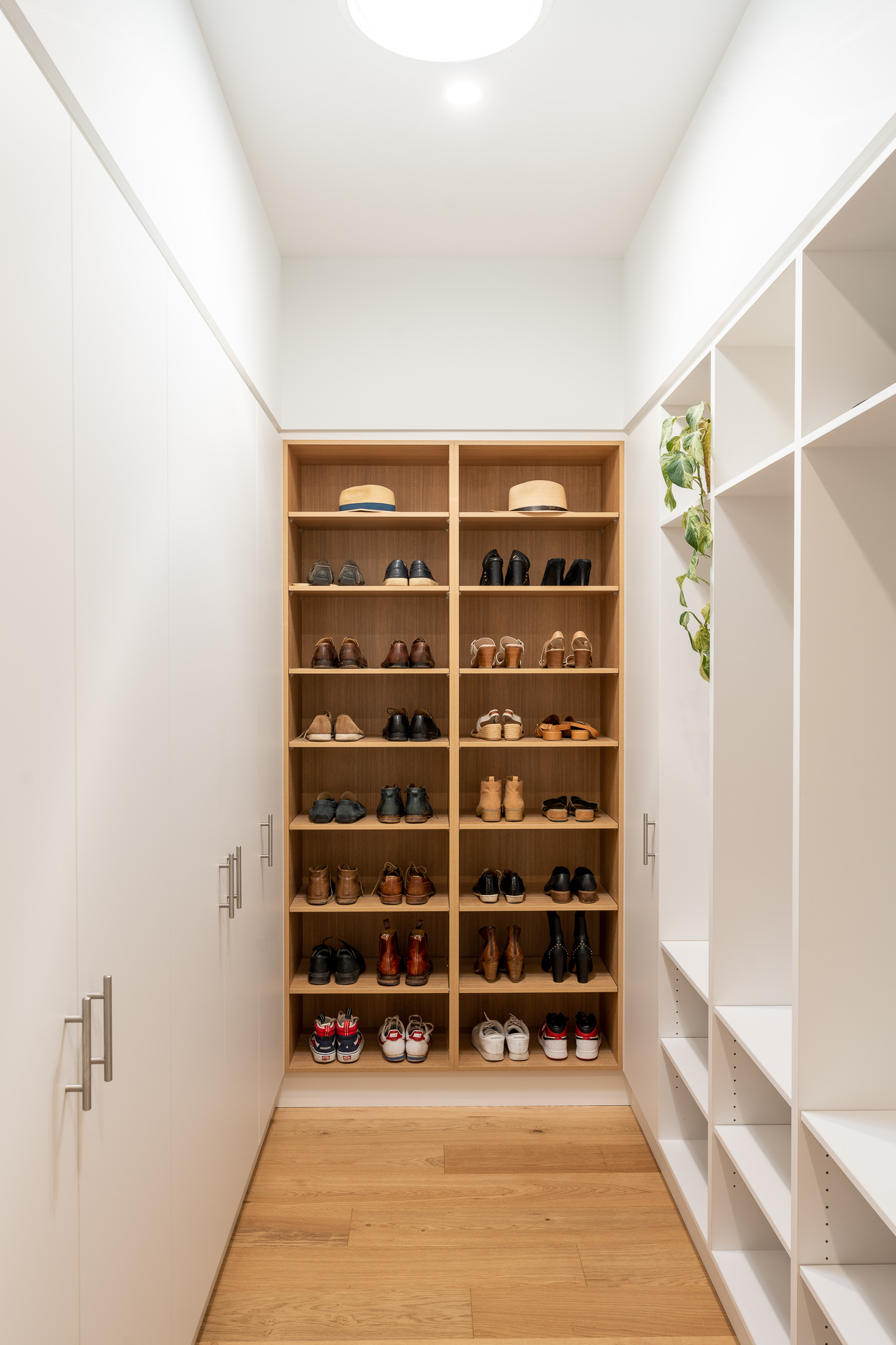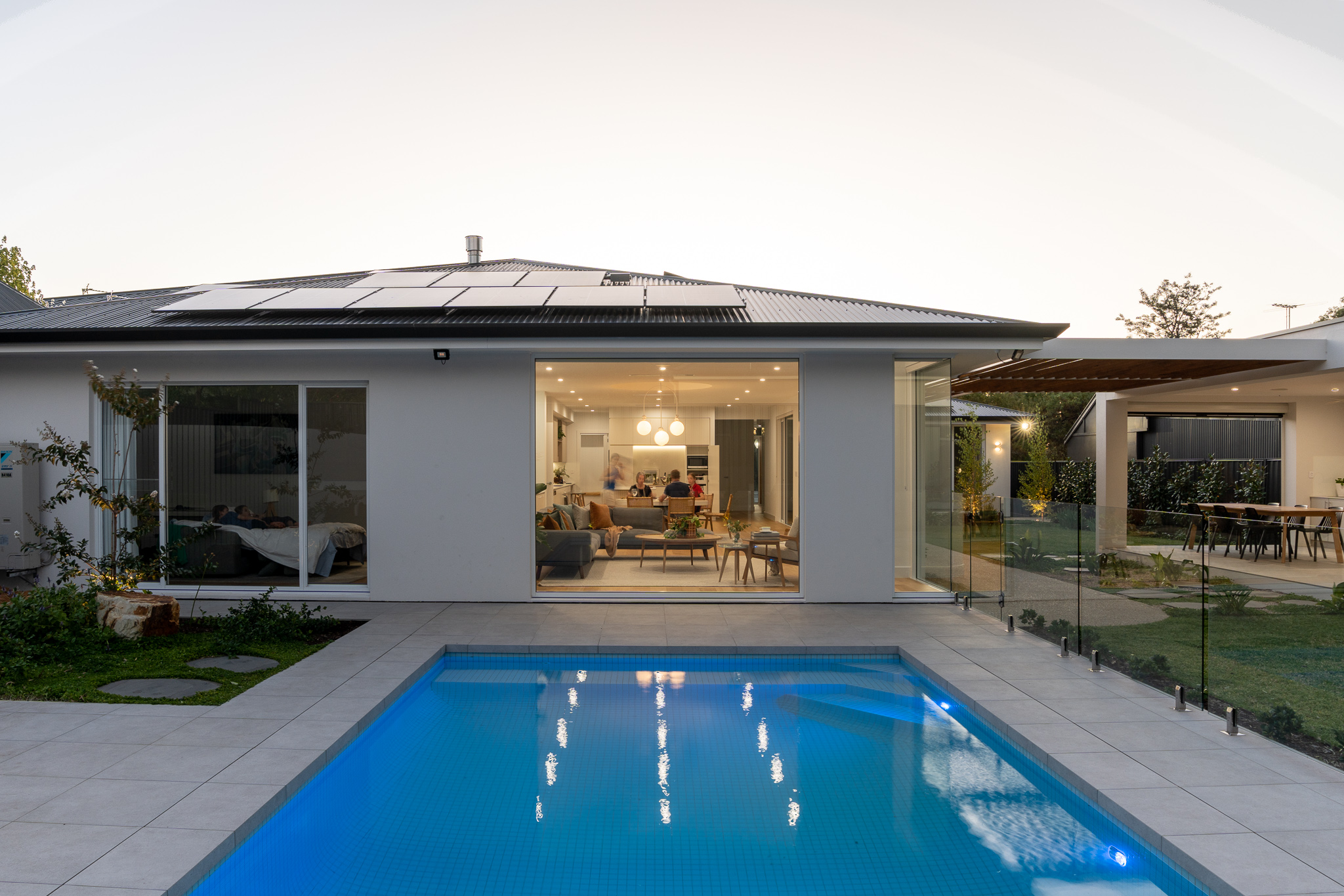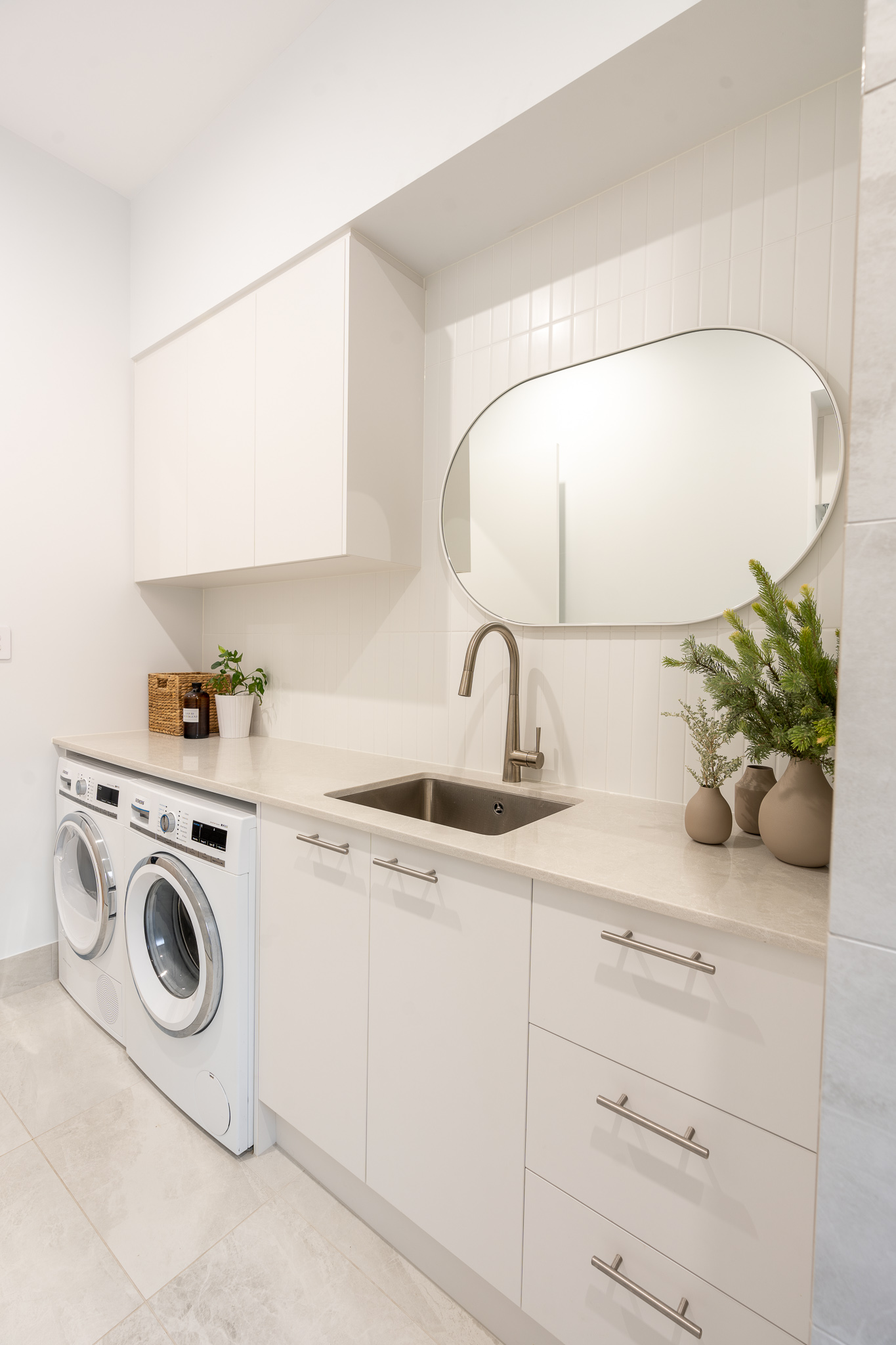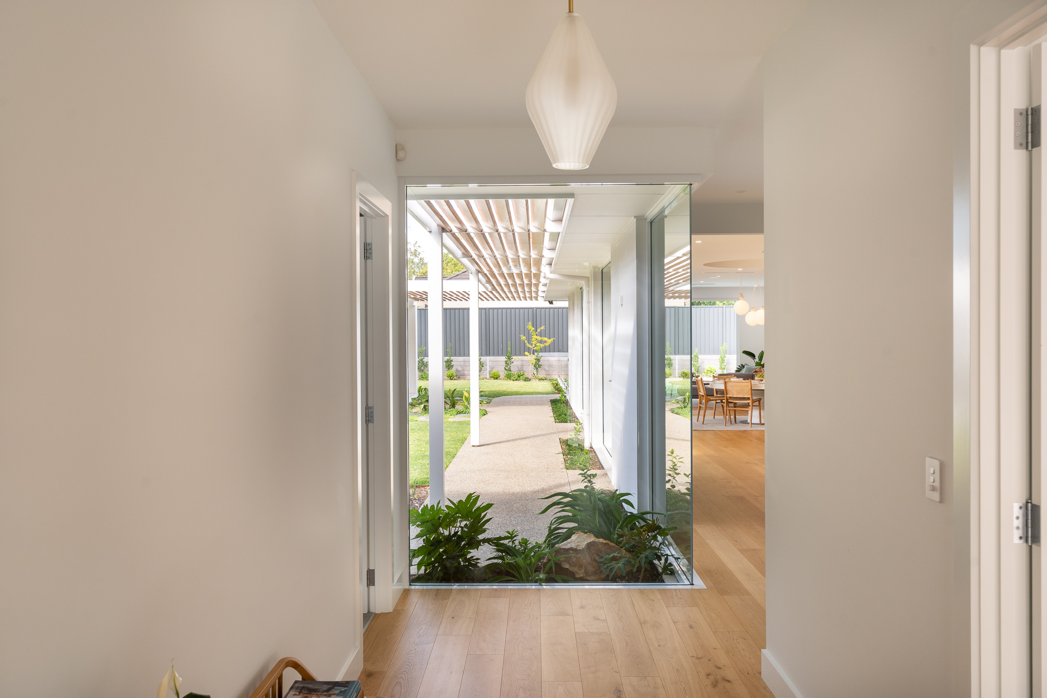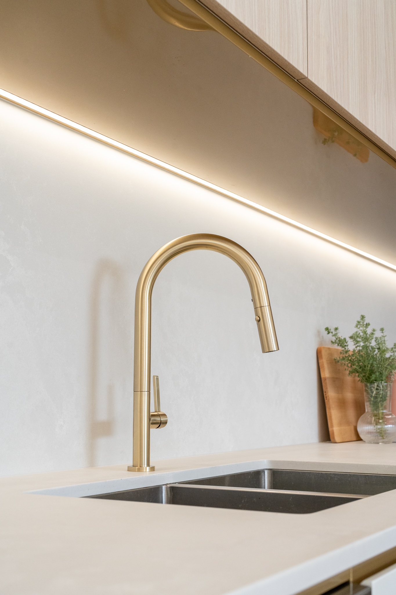At first glance it may seem that the selection of materials and finishes here was a straight forward one. Quite the opposite as we found ourselves head down in the detail with our clients, determining how to pull together such a minimal colour and material palette that felt just right for both the exterior and interior of the home. The inclusion of curves to both the build and joinery elevate the overall feel of the home. Add in the client’s finishing touches including the pendant and large scale artwork to the dining area and it’s magic!